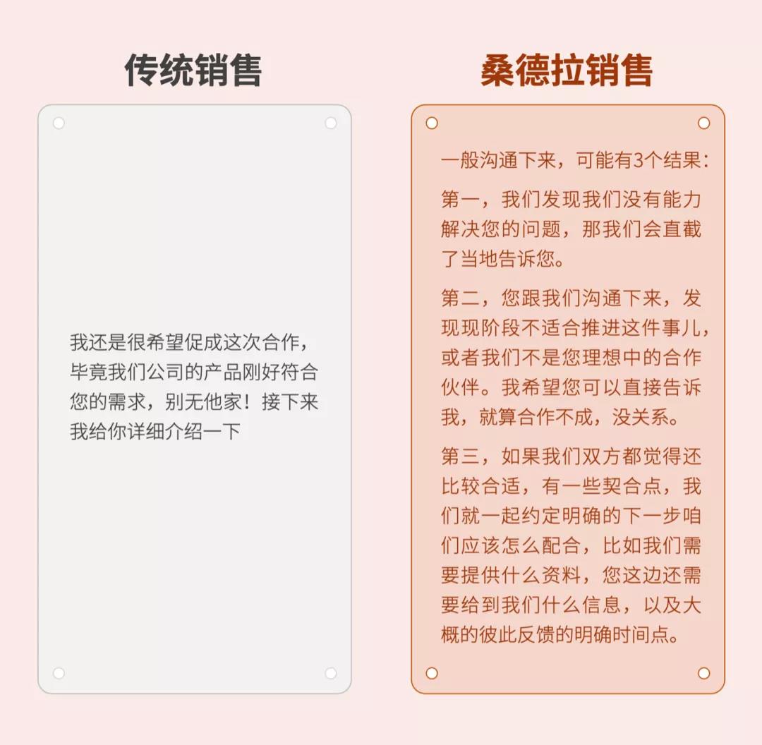 比如,潛水艇的第一個艙門是——銷售要和客戶建立良好的信任關(guān)系,這第一步看似簡單,卻決定了客戶會不會跟你合作。下面,通過幾個案例感受一下傳統(tǒng)銷售和桑德拉銷售的區(qū)別。